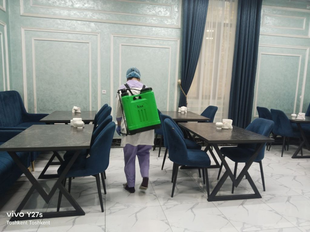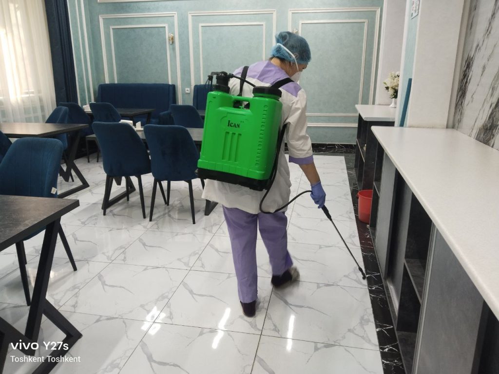 🧴 Dezinfeksiya jarayonida mehmonxonaning barcha ichki xonalari, yo‘laklar, oshxona, hojatxonalar, dam olish hududlari va umumiy foydalanish joylari maxsus kimyoviy vositalar yordamida tozalandi.