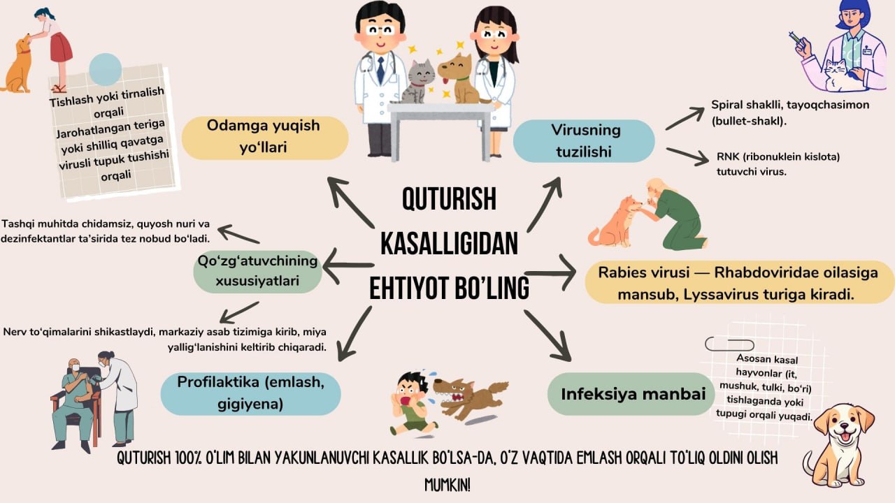 QUTURISH KASALLIGI — O‘TA XAVFLI INFEKSIYA!📍 Quturish — asosan hayvonlardan odamga yuqadigan virusli kasallik bo‘lib, markaziy asab tizimini zararlaydi.Bu kasallik o‘lim bilan yakunlanishi mumkin, shuning uchun profilaktika juda muhim!siz quyidagi infografika orqali quturish kasalligi haqida ma’lumotga ega bo’lasiz.